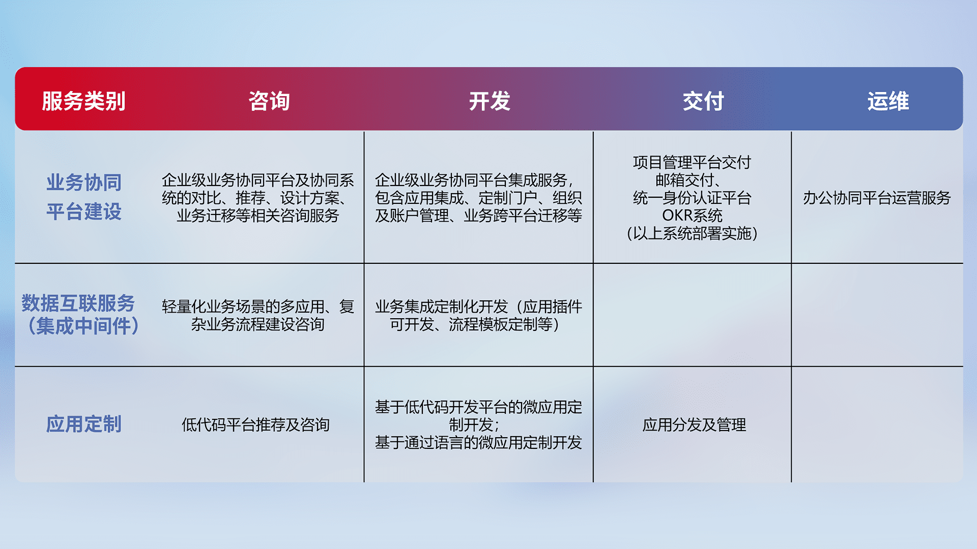 针对钉钉、、、、企微、、、、IDaas等平台级产品提供产品的规划、、方案、、、交付、、、、定制化开发等服务,,实现如统一协同办公、、、智能客户服务、、、混合会议管理、、智能数据查询、、、、等业务场景,,,,实现数字化转型。。
